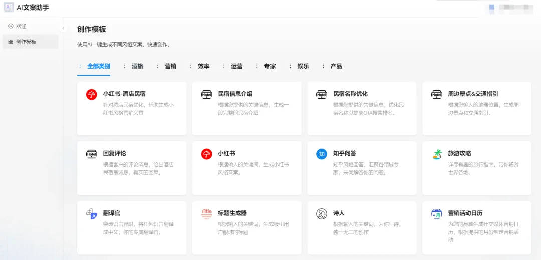 酒店AI助手已上线10+酒旅专属营销模板,包括小红书营销文案生成、标题生成器、民宿信息介绍、民宿名称优化、周边景点&交通指引、客评回复、旅游攻略、营销活动日历等多样化模板,全方位覆盖行业内营销场景,帮您解决各种营销文案撰写。