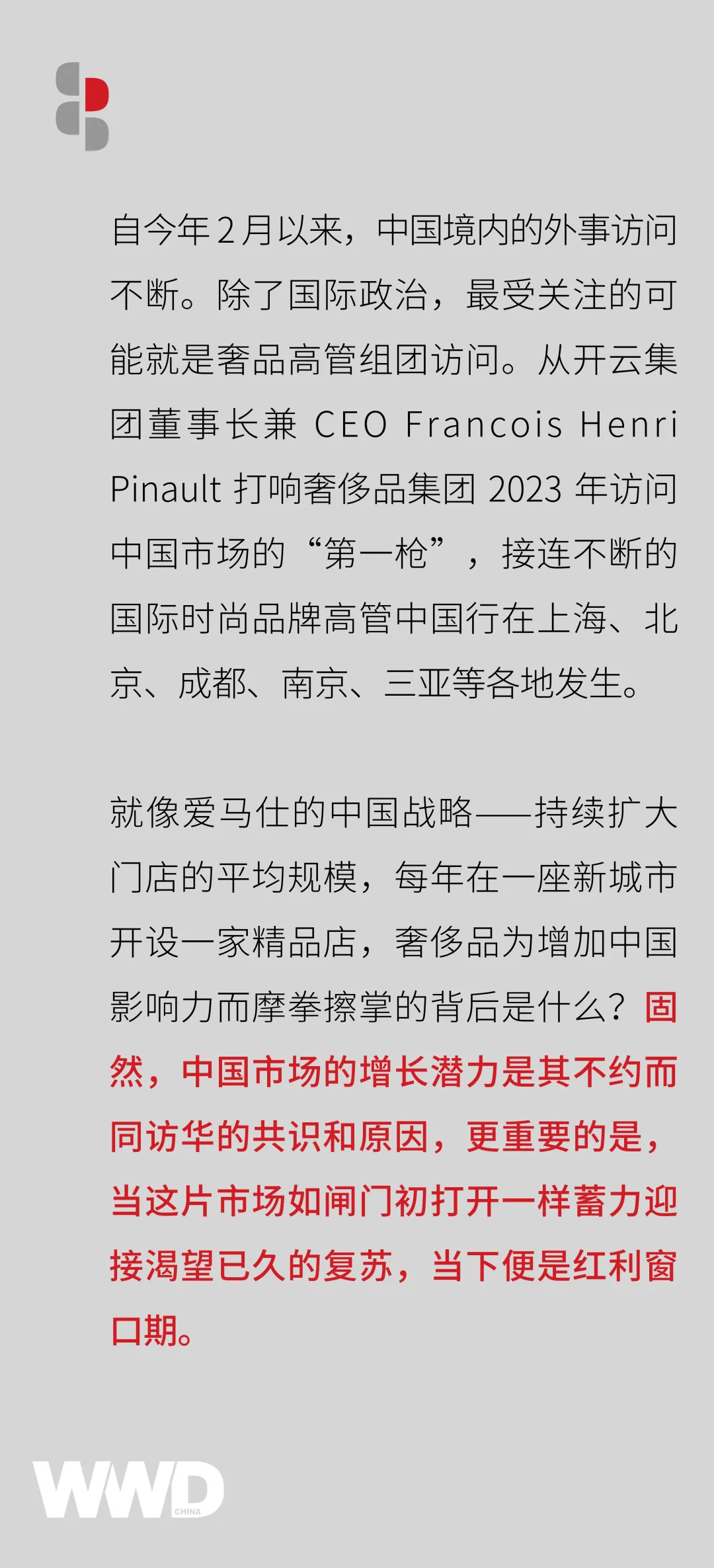 通过一次次考察,中国之于世界消费市场的意义当然一目了然,但战略布局后续究竟能够如何发力并起效表现于消费端?我们密切关注并拭目以待。WWD