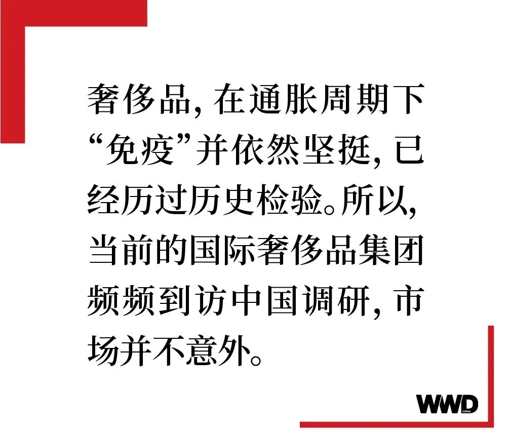 中国消费者正在接过引领经济增长的欧美消费者的火炬。而奢侈品,在通胀周期下“免疫”并依然坚挺,已经历过历史检验。所以,当前的国际奢侈品集团频频到访中国调研,市场并不意外。