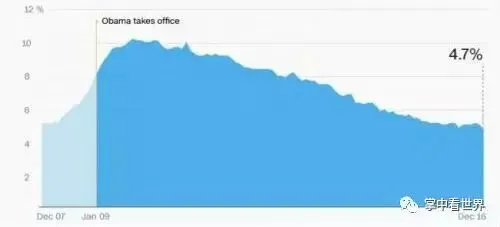 数据显示,与奥巴马8年前进入白宫相比,失业率从当时的7.8%,降至目前的4.7%,达到2007年以来的最低水平。