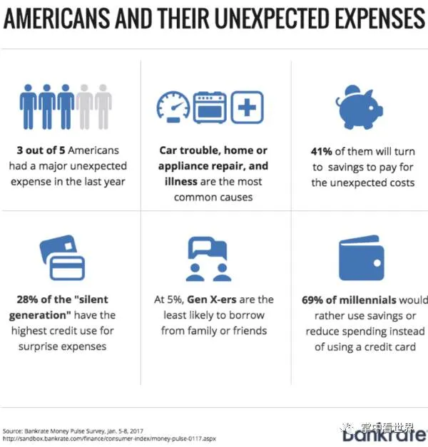 在此次接受调查的1,003名成年人中,五分之三的受访者表示他们或家庭成员在过去一年中面临重大财政支出,汽车、房屋修缮以及生病是最主要的三大方面。