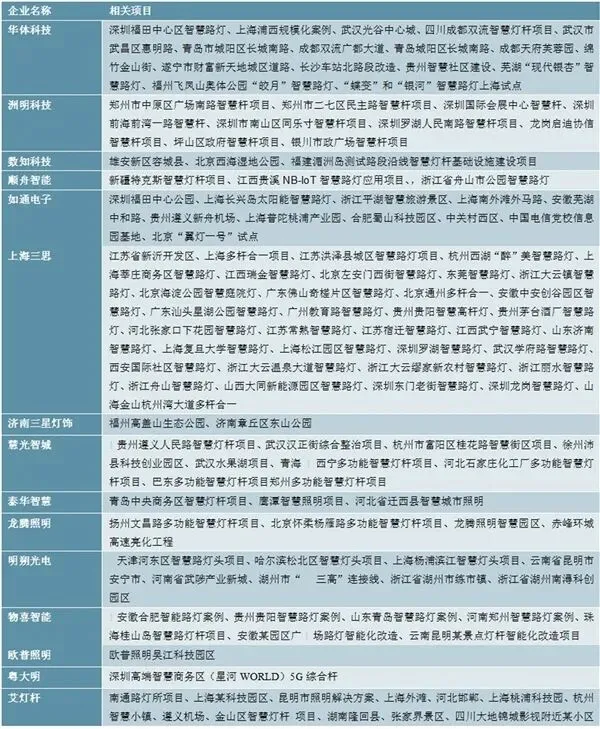 其中,提供智慧灯杆成品的传统照明杆塔企业中,已经拥有落地或在建项目的有华体科技、洲明科技、数知科技、上海三思等14家。