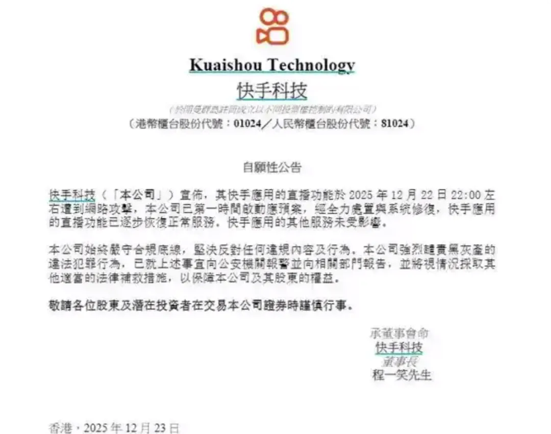 12月23日,快手发布公告回应称,其直播功能在22日晚上22时左右遭遇网络攻击,快手已经第一时间启动紧急预案,经全力处置与系统修复,直播功能已经逐步恢复正常。