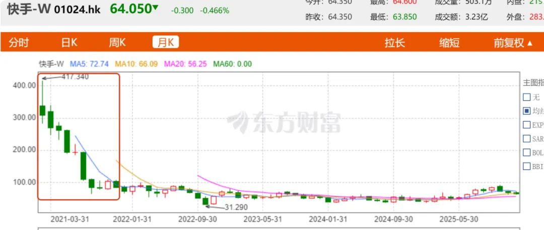 快手遇袭后的第二天,快手股价直接下跌3.52%。在2025年年内快手股价表现不俗,由年初开盘的40.74港元一路涨至10月初的92.6港元,截至12月23日收盘,快手股价为64.35港元,年内涨幅达58%。不过相比2021年417.34港元的股价高点,如今的股价跌幅已达85%。整体市值消失了15246亿港元。