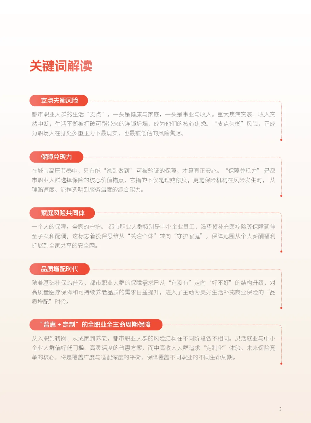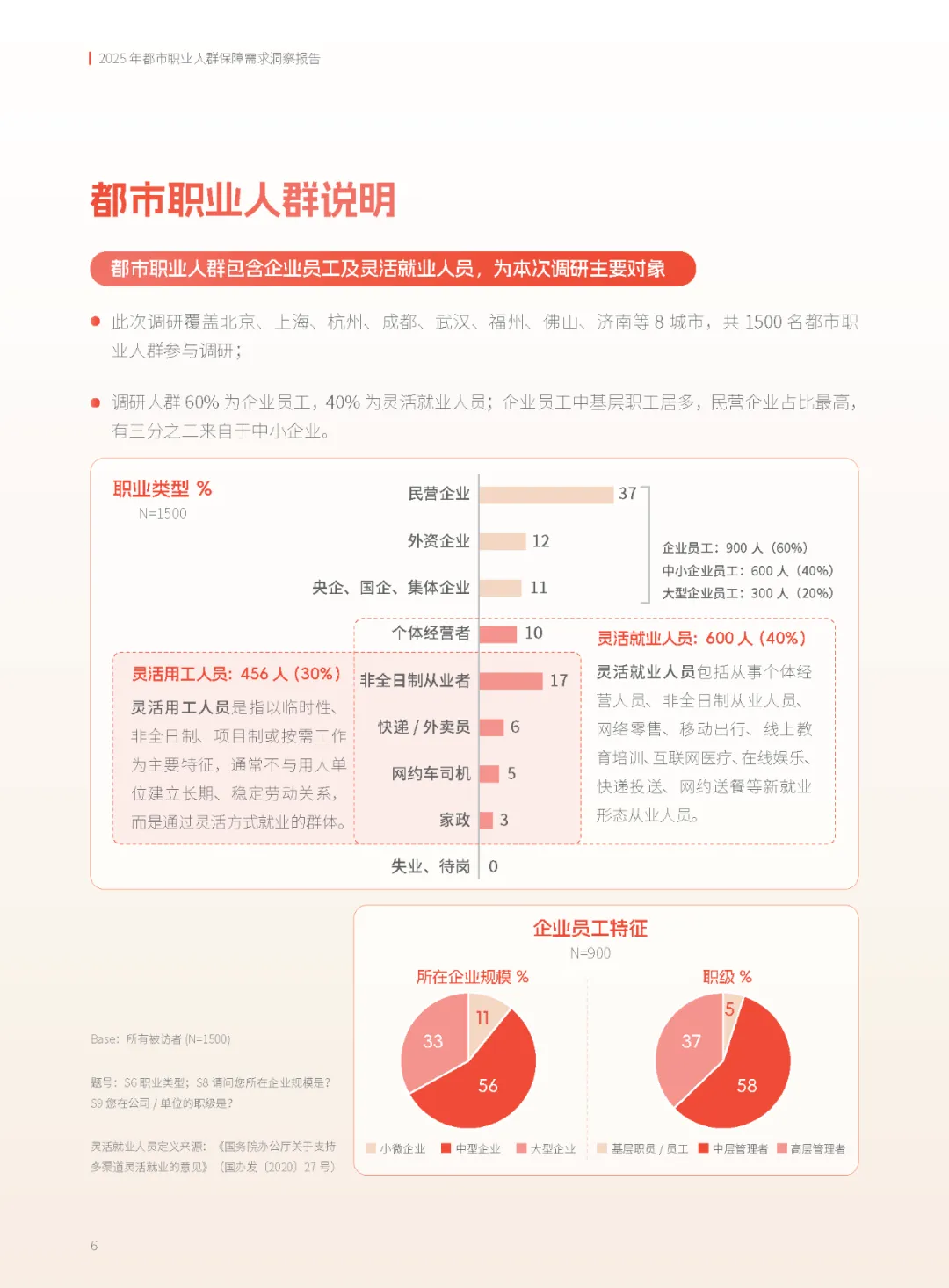 在科技革命与产业变革的浪潮下,新就业形态如雨后春笋般涌现,都市职业人群的职业生涯变得愈发多元与流动。这一变化不仅重塑了工作模式,也深刻影响了人们对保障的需求。《2025年都市职业人群保障需求洞察报告》由南方周末与益普索联合发布,通过对覆盖8个城市的1500名都市职业人群的深入调研,揭示了后基本保障时代下,都市人群在健康、养老、意外等方面的风险认知、保障现状与未来需求。报告指出,随着物质富足到品质生活的追求转变,构建全生命周期的保障体系已成为都市职业人群的迫切需求。