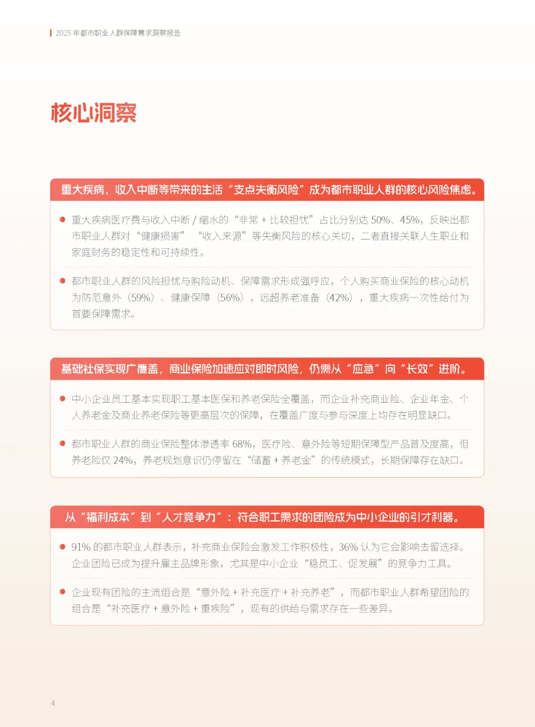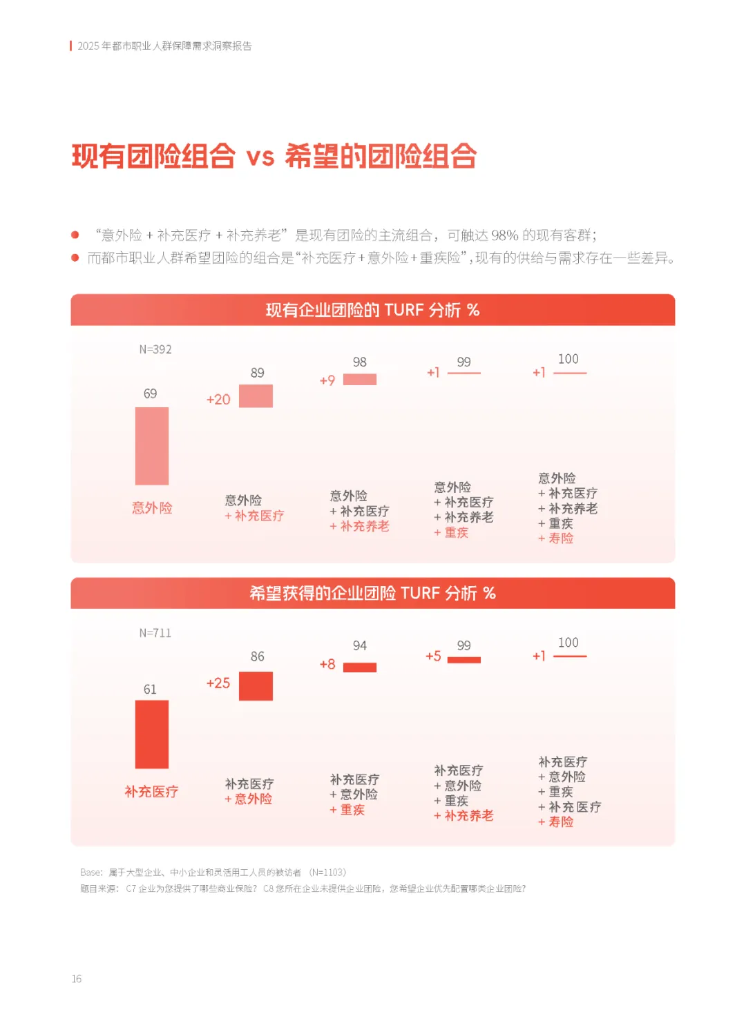 报告指出,现有企业团险主要以“意外险+补充医疗+补充养老”为主流组合,而都市职业人群更希望获得“补充医疗+意外险+重疾险”的组合。这种供需不平衡在中小企业中尤为明显,员工对重疾险和补充医疗险的需求迫切,但企业提供的团险往往难以满足。