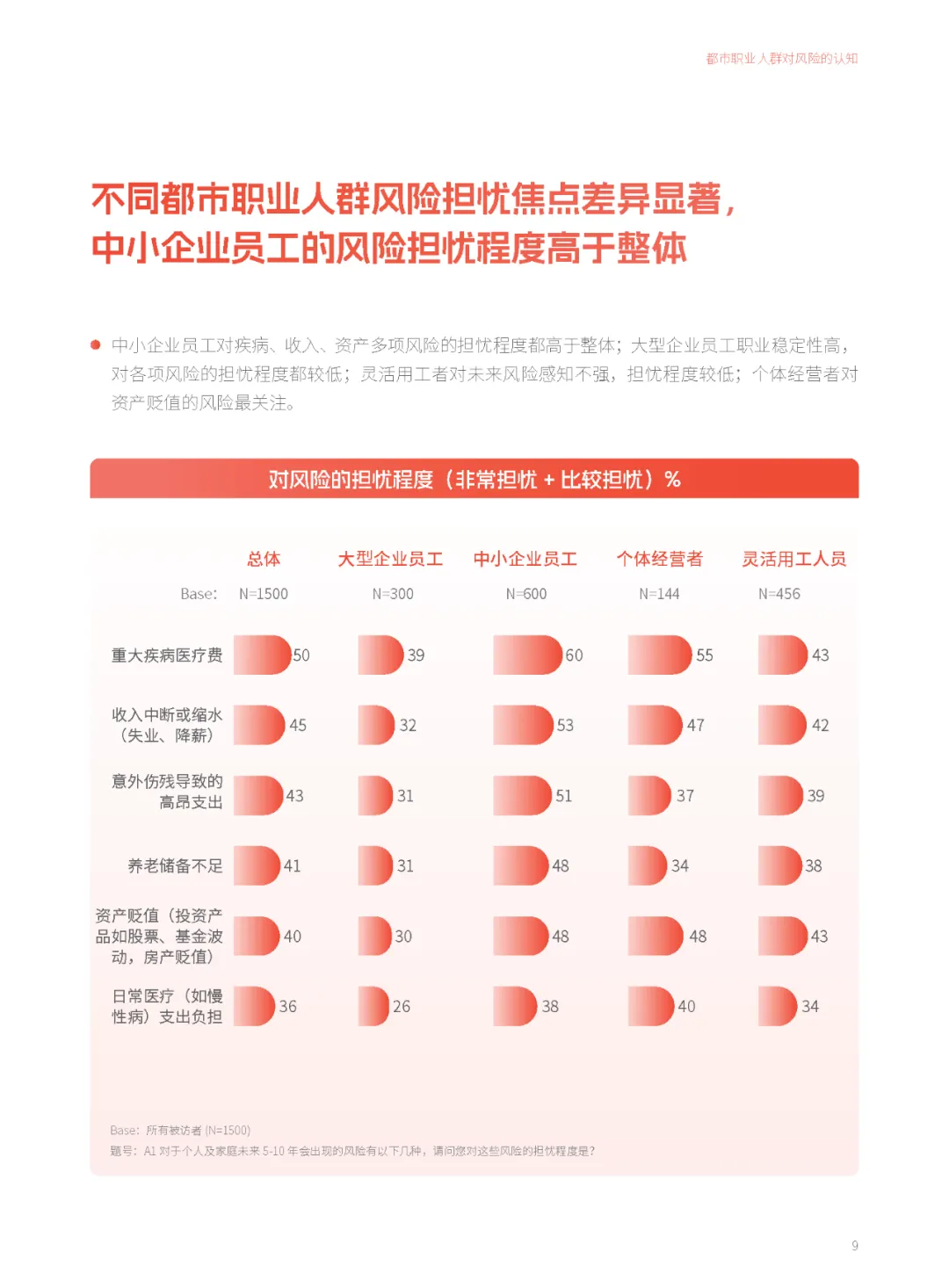 调研发现,重大疾病医疗费与收入中断/缩水是都市职业人群最为担忧的两大风险,占比分别达50%和45%。这两种风险直接关联家庭财务的稳定性和可持续性,一旦发生,可能导致生活平衡被打破,引发连锁反应。尽管社保覆盖面不断扩大,但中小企业员工与灵活就业人员的现实风险仍难以得到完全保障。