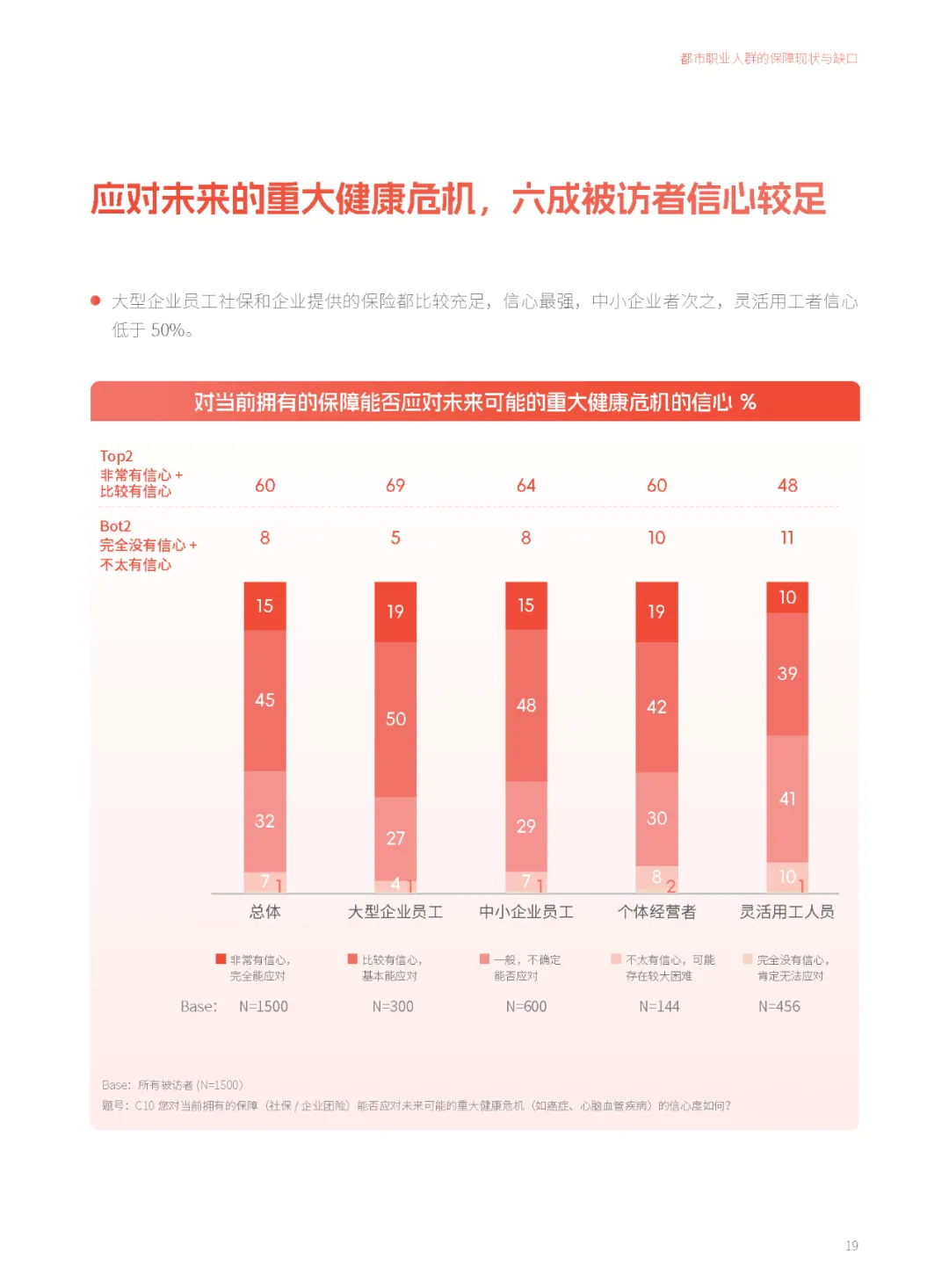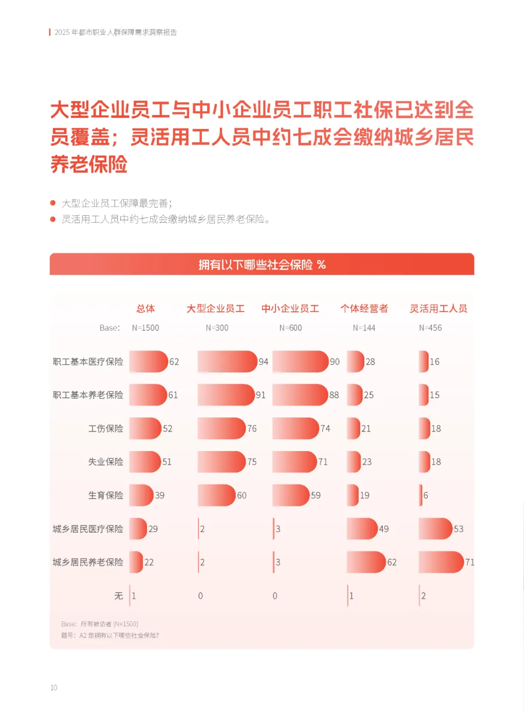 报告显示,中国社会保障体系已基本实现全民医保,形成了职工、城乡居民、灵活就业三大社保体系。然而,随着生活水平的提高,都市职业人群的保障需求已从“有没有”转向“好不好”。超六成受访者表示愿意配置商业养老保险,将其视为提升养老生活质量的重要工具。特别是中小企业员工,对高质量医疗保障和可持续养老品质的需求日益增长,商业保险正成为连接个体需求、企业福利与社会保障的关键节点。