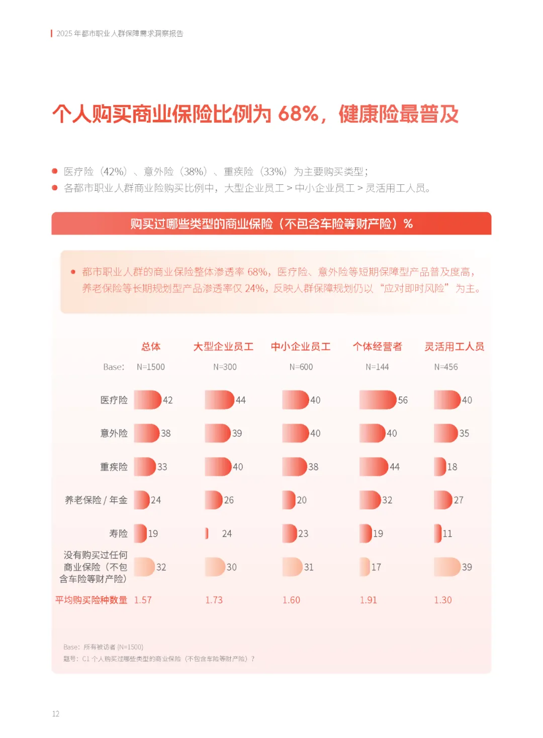 数据支撑:商业保险整体渗透率达68%,其中医疗险、意外险普及度高,但养老险仅24%,反映出长期保障存在明显缺口。