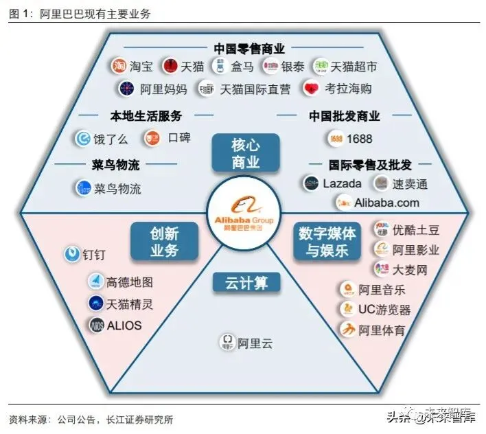 经过 21 年的发展,阿里的业务版图已经从最初的线上批发业务,拓展至线上、线下零 售业务,并从商业拓展至云计算、数字媒体娱乐和多种创新业务。目前,阿里巴巴业务 版图可分为核心商业、云计算、数字媒体及娱乐和创新业务四个板块,其中核心商业业 务板块主要包含:淘宝、天猫和新零售业务等组成的中国零售商业业务,中国批发商业 业务,口碑和饿了么组成的本地生活业务,菜鸟物流业务,Lazada、AliExpress 等组成 的国际零售业务,Alibaba.com 等组成的国际批发业务;云计算板块主要包含阿里云开 展的各项业务;数字媒体与娱乐业务主要涵盖优酷土豆、阿里影业、阿里音乐、UC 浏 览器、大麦网等业务;创新业务则主要包括钉钉、高德地图、天猫精灵等。
