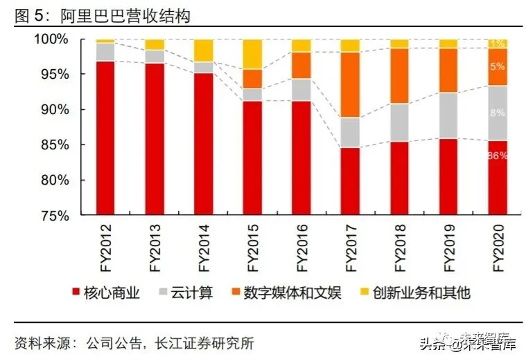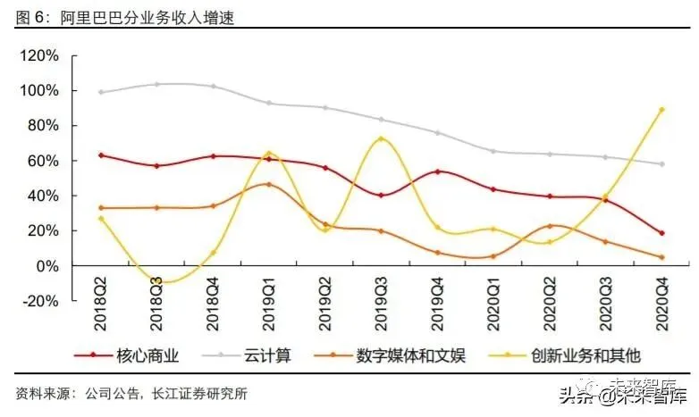 收入端来看,阿里收入增速虽开始放缓,但仍处于高位。阿里 2020 财年营收 5097 亿 元,同比增长 35%。分业务来看,核心商业业务是阿里主要的收入来源,2020 财年共 实现收入 4361 亿元,同比增长 34%,占比 86%;云计算业务营收 400 亿元,同比增 长 62%,占比 8%;数字媒体和文娱业务主要包括 UC 浏览器、优酷土豆、阿里影业等 业务,营收 269 亿元,同比增长 12%,占比 5%;创新业务和其他业务主要包括高德地 图、钉钉、天猫精灵等,营收 66 亿元,同比增长 42%,占比 1%。