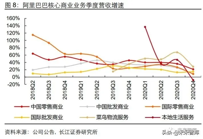 对收入占比 86%核心商业业务进行进一步拆分,其中中国零售商业是主要的收入贡献业务,菜鸟物流及本地生活业务增长较快。具体而言: