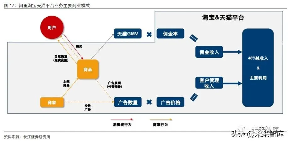 总结而言,阿里核心零售的商业模式基本可以概括为:阿里作为平台方吸引 B 端商家和 C 端用户交易,通过直接抽取交易佣金,以及提供商家以营销引流服务为主的工具两种 方式实现变现。显然,阿里的淘宝天猫平台商业模式运营的基础在于撮合用户和商家双 方交易:于 C 端吸引用户进入平台激发其购买需求,于 B 端吸引商户入驻平台供给优 质多样化商品。
