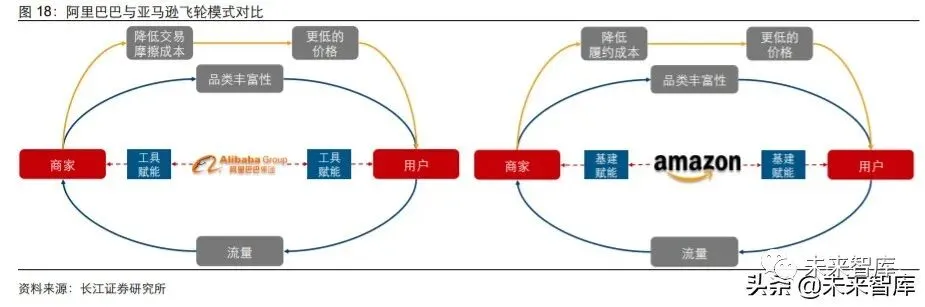 如我们在前期发布的报告《纵览电商之二:亚马逊的护城河》中描述的“飞轮效应”所 述,商家与消费者可在电商平台上形成相互促进的良性循环,其背后的原理是:消费者 选择购买渠道时一般会考虑三个因素:品类丰富度、商品的价格和渠道服务质量(包括 使用体验、配送时效性、客服质量等),其中品类丰富度和无补贴情况下商品的价格是 由供货商家决定的,而商家对于渠道的选择则主要取决于:1)市场规模,即消费者(用 户)数量和人均消费;2)渠道效率(渠道 ROI 水平、物流等其他环节工具成熟度等)。作为交易平台提供方,阿里和亚马逊推动用户和商家入驻的方法存在不同,但核心均是 提高效率降低渠道流通环节成本,具体而言: