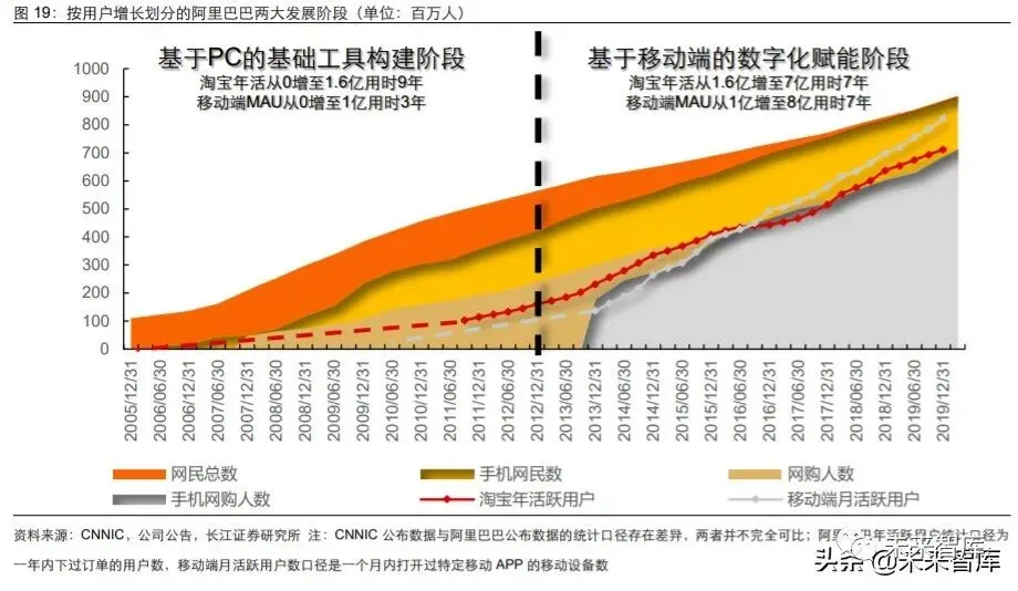 2013 年至今是阿里乘无线设备普及之风从 1 到 N 的时代,在移动端用户规模迅速提升, 公司将快速增长的数据转化为数字化赋能工具进一步降低摩擦成本。2013 年阿里巴巴 推动“All In 无线”战略,抓住了智能手机设备快速普及的浪潮,年活跃用户数从 2013 年初 1.6 亿增至 2019 年底 7.1 亿仅用时 7 年,移动端 GMV 占比已提升至 75%以上, 同时阿里将大规模的消费行为数据进行沉淀和输出,以个性化推荐、智能营销工具等方 式赋能用户和商家,除了基础的交易、交流以外,拓展物流、金融、技术等综合服务工 具,系统性降低交易成本,提升商家和顾客的体验,实现了飞轮的进一步加速。另外, 阿里也将赋能边界拓展至线上零售场景之外,延展至实体零售和商家经营的更多环节。