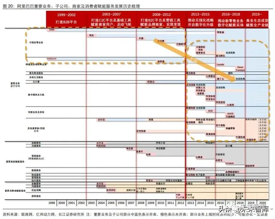 接下来,我们将对阿里巴巴不同发展阶段所处的背景环境,以及公司做出的具体行动进 行详细拆解,以深刻理解阿里巴巴创造、迭代赋能工具的逻辑以及其能力边界的变迁。