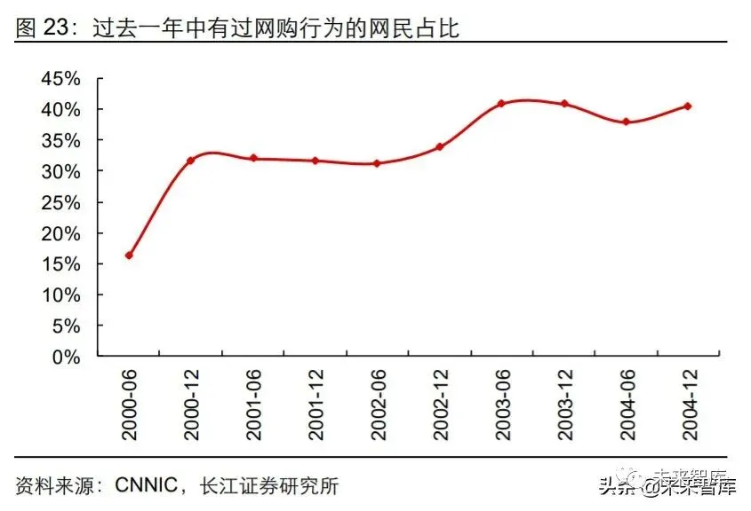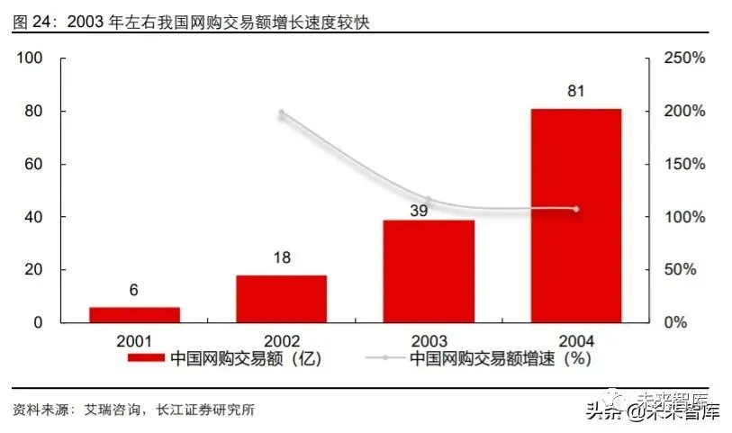 线上购物市场快速增长,为淘宝提供了弯道超车的便利条件。从整体上看,2003 年前 后我国互联网普及速度较快,同时网购普及程度开始逐步上升。从 1999 年至 2004 年,中国的互联网用户从 890 万人增加 9400 万人,期间年复合增长率达 60%。我国线上购 物行业也于 90 年代末起步,伴随互联网的普及,具有性价比与便捷性优势的线上购物 迅速的在网民中传播,2000 年时网购行为占网民比例仅为 16%左右,2004 年快速增长 至 40%左右。从规模角度看,2004 年我国网购交易额达 81 亿元,同比增长 108%。快 速增长的新增网购用户尚未形成平台黏性,为淘宝的初期发展提供了条件