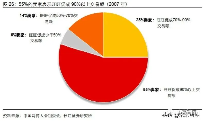 阿里巴巴适时推出即时沟通工具淘宝旺旺,有效促进了线上交易。2003 年左右,易趣 为防止买卖双方交流后绕过平台进行交易影响佣金收取,因而并未开放即时沟通工具, 只允许卖家以留言的方式进行低效沟通。而对短期盈利压力较低的阿里则在 2004 年 6 月推出即时沟通工具淘宝旺旺,赋能售前沟通环节,进一步促进了对买卖双方摩擦成本 的降低,2007 年的一项调查显示,55%的卖家表示旺旺促成了 90%以上的交易额。