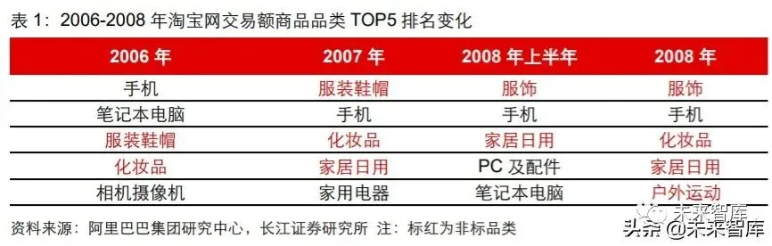 从淘宝上的品类结构来看,这一逻辑也得到验证。2005 年,CNNIC 数据显示买家在淘 宝与易趣中购买服装鞋帽等非标品比例的差距高于 3C 家电等标准品。从交易额来看, 2006 年,服装鞋帽品类位居淘宝网交易额第三,2007 年开始连续位居交易额首位,考 虑其单价大幅低于手机、笔记本等数码产品,服装品类为淘宝贡献的交易量及交易频次 十分可观。直至今日,服饰和化妆品至今依然是淘宝/天猫的主力品类。