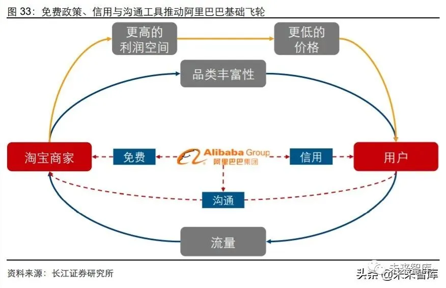在发展初期,阿里巴巴通过推出信用保障工具支付宝赋能交易环节,降低用户网购时的 摩擦成本,从 C 端推动飞轮;推出免费政策,降低线上渠道成本,以吸引商家入驻实现 品类丰富的同时,为商品留出更大的利润空间以降低商品价格,从 B 端推动飞轮;推出 沟通工具淘宝旺旺作为非标商品图文展现的补充,降低信息不对称从而降低退换货等摩 擦成本,加速飞轮转动。
