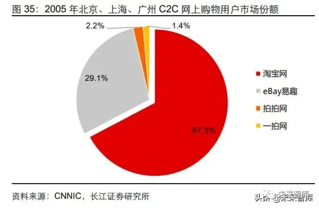 从效果上看,在阿里推出赋能工具启动飞轮后,淘宝迅速超越易趣成为国内网购市场的 绝对龙头,2006 年淘宝交易额市占率已达 82%,而易趣交易额市占率则从 2003 年的 72%迅速降至 2006 年的 15%。2005 年北上广三城市网购用户群体中,淘宝网市占率 已达到 67%,远超易趣的 29%。