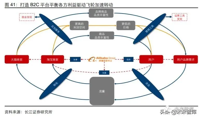 总结来说,阿里巴巴通过推出 B2C 平台天猫,实现了对飞轮模式的完善和加速。天猫 上线顺利解决了淘宝平台低价竞争等的问题,释放了品牌商家的盈利空间,吸引高质量 商家入驻,从 B 端推动飞轮;高质量商家入驻拓展了大量高品质品牌商品,进而提升了 高需求用户的购物体验,从 C 端推动飞轮。阿里自身也通过在平台运营中提供营销引流 工具和佣金抽成实现了变现。