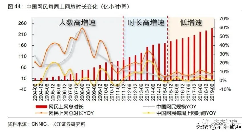 2011 年开始,我国智能手机市占率快速提升,手机网民数量也开始随之上升,于 2012 底超过 4 亿,移动互联网渗透率超过 40%。同时,应用高速 3G 网络的智能手机快速普 及,推动移动端信息传递形式从以文字为主逐渐转变为图文等丰富形式,给予了购物、 社交、视频等移动 APP 较大开发空间,微博、优酷等大量移动 APP 相继上线,大幅优 化使用体验,用户开始在多场景下利用碎片时间上网,推动用户上网时长快速增长。