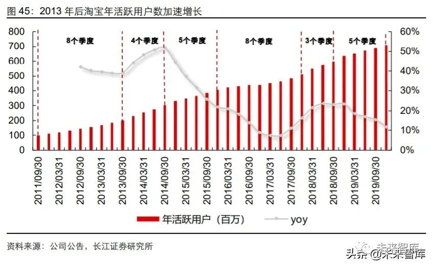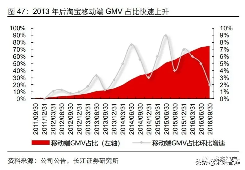 因此,在 2013 年左右用户向无线设备转移的趋势出现时,阿里巴巴快速制定“All In 无线”战略,大力推动淘宝天猫的无线移动化,实现了用户数量与 GMV 的加速增长。淘宝年活跃用户数从 1 亿增至 2013 年 3 季度的 2 亿用时 8 个季度,而 2013 年底“All-in 无线”战略开启后,从 2 亿增至 3 亿、3 亿增至 4 亿的用时分别仅为 4 个季度和 5 个季 度。从 GMV 角度看,2014 年阿里移动端 GMV 占整体 GMV 比重加速提升,驱动阿里 整体 GMV 在基数逐渐增长的情况下仍实现了加速增长。