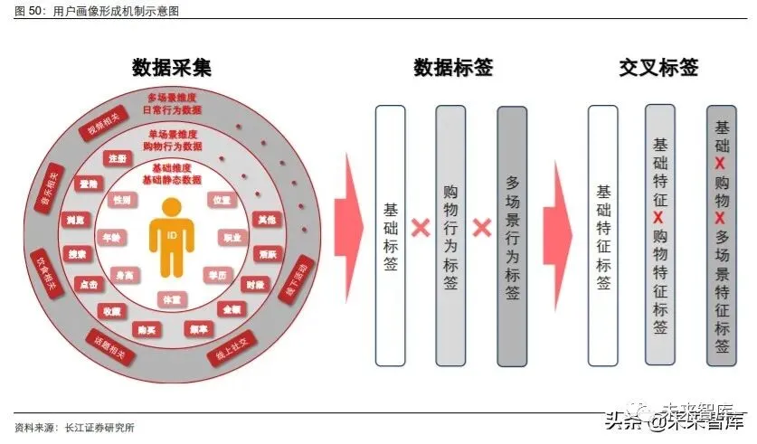 在高准确度的基础上,数据维度全面性其实是对用户画像质量影响最大的因素之一。在 用户知情且同意的情况下,公司对数据的沉淀维度包括但不限于:1)用户相对静态的 基础数据,如性别、年龄等,一般可以通过注册填表等途径进行沉淀;2)用户在购物 场景下的动态行为数据,包括浏览、搜索、点击、购买等数据,一般可以通过记录本网 站访问数据等方式沉淀;3)反映用户在购物外场景的动态行为数据,包括视频、音乐 等媒体信息,线上社交兴趣信息,线下活动信息等,数据可来源于其他 APP/网站。