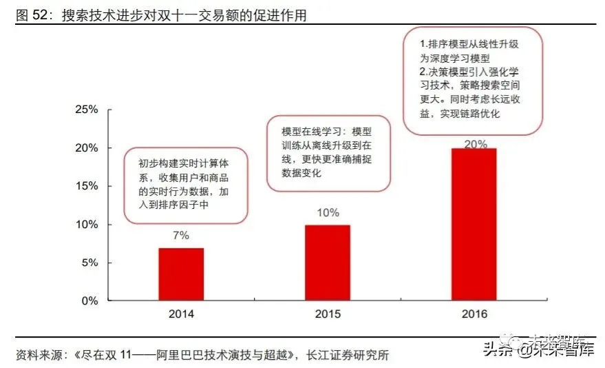 从结果上看,千人千面搜索是用户画像最直接的应用之一,其上线直接拉动双十一成交 额增长。早期,淘宝在用户输入搜索关键词后直接通过传统的 Query 匹配出相似关键词 商品,而不考虑用户的特性与需求,2013 年阿里在无线端开始使基于数据为用户打标 签的千人千面技术后,搜索算法转变为了“Query+用户前后行动+地域+时间”,开始将 基础及少量购物场景标签纳入搜索结果排序中;2014 年实现了标签数据的全面实时化, 将实时数据引入搜索的召回和排序;2015 年之后开始引入不断进化的深度学习模型进 行优化。从效果上看,搜索技术进步在 2014~2016 年的双十一活动中分别拉动了 7%、 10%和 20%的销售额增长。
