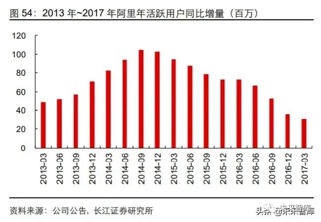 对于商家而言,千人千面技术成功稳定了平台商家的线上渠道成本。如上文所述,在资 源位有限的情况下,竞价机制下商家的竞争将推升广告价格,但事实上,2014 年后广 告单价并未出现持续增长,从阿里的报表端的客户管理收入拆解上来看, 2013Q2~2014Q1 客户管理收入的增长中 35%来自广告量增长,15%来自于点击单价增 长;而 2014Q2~2015Q1 客户管理收入的增长中 55%来自广告量增长,点击单价则出 现了 21%的负增长;2016Q2~2017Q1 在活跃用户数增长绝对量低于 2013 年同期的情 况下,广告单价依然基本持平,而广告数量同比增长 47%。这也在一定程度上证明了上 文的结论:阿里通过构造用户画像实现个性化推送广告商品,实现资源位的变相扩充从 而稳定营销工具竞拍价格,保证商家 ROI 以提升购买营销工具的积极性,最终使得营销 工具使用量大幅增长,实现良性循环。