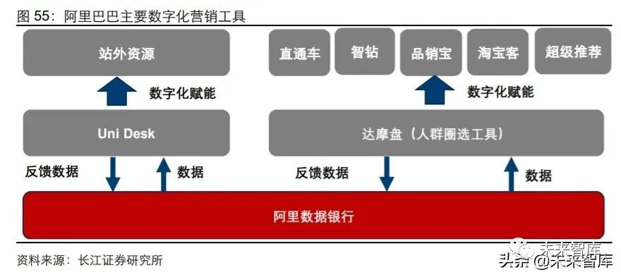 同时阿里巴巴将自身沉淀的数据打造为多样化的数字化营销工具赋能商家。2013 年阿 里推出生意参谋;2014 年推出针对直通车钻展等营销投放的人群圈选工具达摩盘;2016 年将钻展升级为智钻增加智能报价投放功能;2017 年推出品牌数据银行和全域营销工 具 Uni Desk,实现品牌用户全域营销的数据回流积累;2018 年基于个性化推荐的“猜 你喜欢”页面进入手机淘宝第二屏,当年双十一推荐流量超过搜索流量;2019 年从推 出针对猜你喜欢页面的推广营销工具超级推荐,实现了对千人千面技术的直接变现。