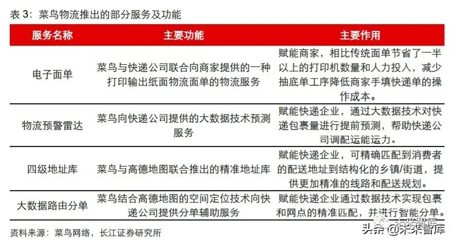 如上文所述,基于对用户行为趋势的长期洞察,阿里可以形成对商品销量的预测,从而 提前指导商家备货、入仓等前期准备工作,而后通过电子面单系统快速对接商家与快递 的信息系统实现发货效率的提升,在末端配送环节通过四级地址库和智能分单等数字化 服务提高快递企业效率,从而提升末端物流环节的整体能力。