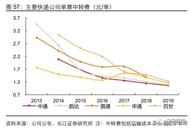 从效果上看,在菜鸟网络的数字化赋能辅助及各家快递企业的管理优化下,2013 年后 我国主要快递企业的快递有效申诉率明显下降,2018 年圆通、中通、韵达、百世、申 通的每百万单有效申诉单数分别为 2.7/0.9/0.8/1.3/1.7 单,相比 2013 年水平分别下降 15/24/37/42/31 单。从快递企业效率角度看,2013 年后各家单票中转费用也出现了持 续下降。