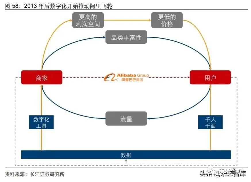 总结来说,2013 以来技术迭代推动无线手机快速普及,阿里巴巴快速反应推出“ALL IN 无线”战略,将发展重心转移至手机淘宝,并投资收购众多优质社交、传媒公司,打通 用户体系,提升自身用户画像构建能力。进而推出千人千面增强用户购物体验,降低搜 索结果页需求不匹配带来的摩擦成本,从 C 端推动飞轮;上线数字化赋能工具,增强营 销环节的精准程度,提升店铺 ROI,从 B 端推动飞轮。同时,将数字化能力外部化至物 流端进一步降低商家线上运营成本并提升用户物流服务体验。因此我们认为,自 2013 年后,数字化能力开始成为阿里飞轮持续运转的重要动力。
