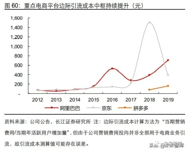 当前,整体互联网用户规模达到约 11.33 亿人,开始面临增长压力,而其中移动购物用 户体量达到 9.95 亿人,相比于互联网用户渗透已经达到约 88%,未来基于用户体量的 扩容空间相对受限,对应来看重点电商平台的用户边际引流成本随之出现上升。