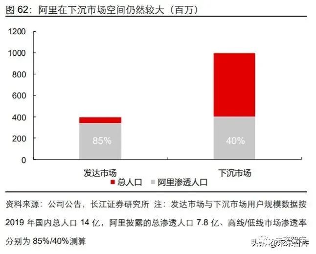 站在当前时点,领先的数字化能力为阿里铸造了坚实的基本盘。从 C 端角度看,网络用 户总量提升空间有限,但低线市场渗透率仅为 40%,相对高线市场 85%的渗透率而言 空间仍然较大,作为用户体验较好的成熟电商平台,有望随着下沉市场用户使用习惯养 成加速拓展低线市场用户。针对存量用户运营,阿里在应用用户画像进行精准分发的基 础上,加入图文推荐、直播等模块推动淘系 APP 内容化增加用户使用黏性,并在电商 类 APP 使用时长可能存在天花板的情况下,通过外部内容 APP 引流将完成交易前的种 草等耗时环节转移至体外,从而增加淘系 APP 单位使用时间内的 GMV 转化效率。
