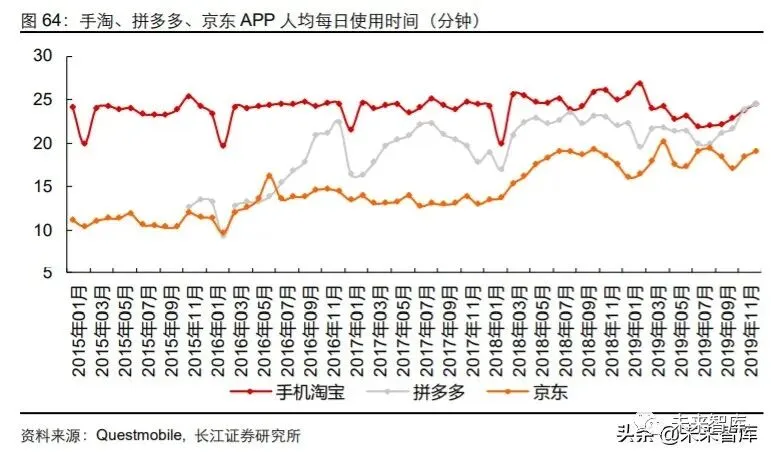 手淘内容化并未有效拓展单用户使用时长。第三方数据显示,2015 年以来手淘 APP 的 人均每日使用时间中枢保持在 25 分钟左右,未出现明显上行趋势,说明内容的加入并 未能有效增加用户使用时长。我们认为这一现象或由于线上购物场景本身可承载的使用 时长存在天花板,即用户在总上网娱乐时长有限的情况下,愿意投入在纯购物 APP 中 的时长是有限的,京东、拼多多用户人均每日使用时间同样在 20 分钟左右开始收敛也 可以在一定程度上佐证这一假设。