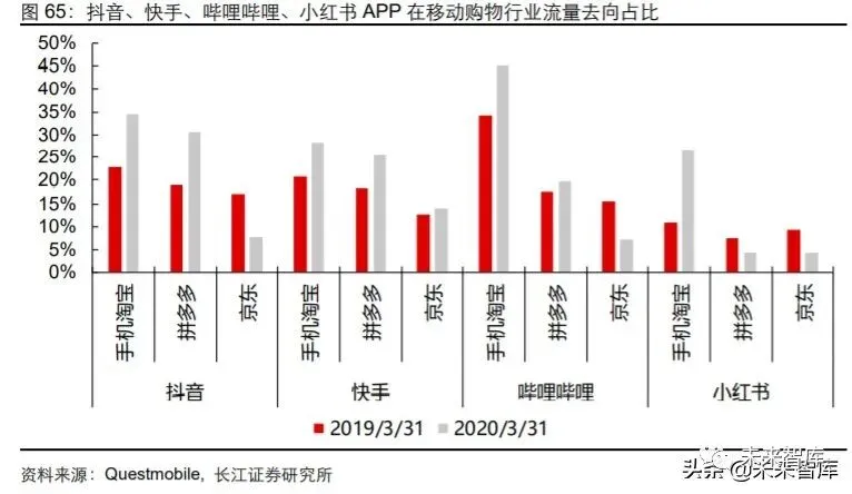 2020 年 3 月,抖音、快手、哔哩哔哩、小红书四个主要内容 APP 用户执行向电商购物 类 APP 的跳转次数中,手机淘宝占比分别为 35%,29%,45%和 27%,均领先于拼多 多和京东;从占比变化角度来看,手机淘宝在上述四个内容 APP 的跳转占比分别同比 提升 12、8、11 和 16 个百分点。