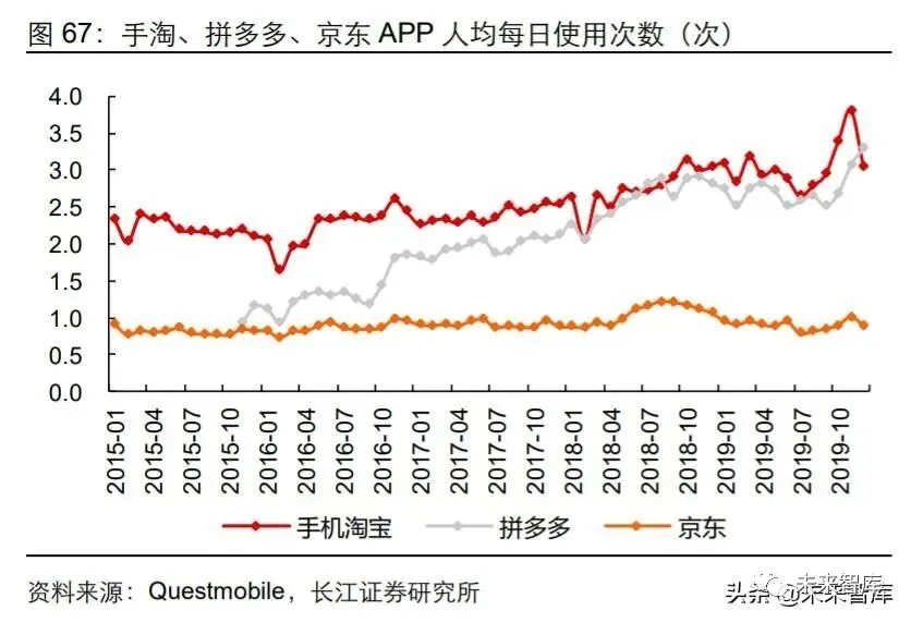 2018 年开始兴起的直播带货有望在未来推动用户使用时长增长,加速淘宝内容化进程。淘宝直播于 2016 年上线,2018 年开始迎来爆发式增长,2020 年财年淘宝直播 GMV 同比增长超 100%;根据 2020 淘宝直播盛典上披露的数据,2019 年淘宝直播已累积 4 亿用户。从使用时间上看,2018 年淘宝直播用户日均使用时间为 30 分钟左右,2019 年淘宝直播重度用户规模持续扩大,每天观看时长超过 1 小时的用户同比增长达到 40%。未来随着淘宝直播的渗透广度及用户使用深度提升,或将推动淘宝APP使用时间上升。