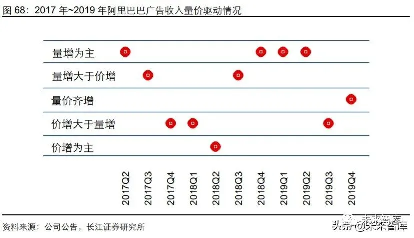 对于淘宝天猫商家而言,其线上渠道效率主要由平台的 ROI 决定,即每一元广告投入 转化的 GMV。如同上文所述,在资源位有限的情况下,竞价机制下商家的竞争将推升 广告价格,阿里通过在搜索端使用千人千面技术变相拓展资源位成功解决了这一问题, 2017 年至今,阿里广告收入的增长以数量增加为主,价格增长的情况相对较少。