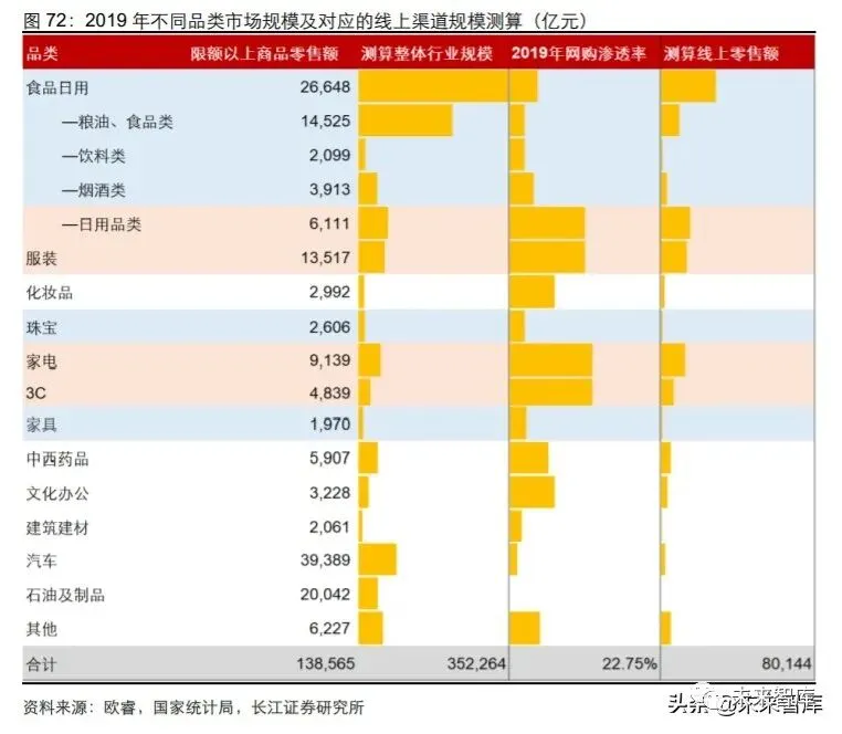 2015 以来,服装、家电 3C 等线上渠道主力品类的线上销售额增速开始放缓。服装、家 电 3C 品类线上渗透开始时间相对较早,且因其品类特性线上渠道销售规模迅速增长, 2019 年线上渗透率均已接近 50%,线上市场规模也分别达到 1.3 万亿和 1.6 万亿以上。在基数扩大的背景下,2015 年开始其线上渠道零售额增速开始快速下降,2019 年均已 降至 20%以内。而对于生鲜食品等因具有重购买体验或不易运输特点的品类,仍以线下 商超渠道和菜市场渠道为主,尽管行业空间巨大,难以以纯线上的方式实现渗透。因此, 阿里开始尝试布局线下零售市场,将自身对用户消费行为的洞察等数字化能力赋能线下 零售渠道以实现对生鲜食品行业的渗透。