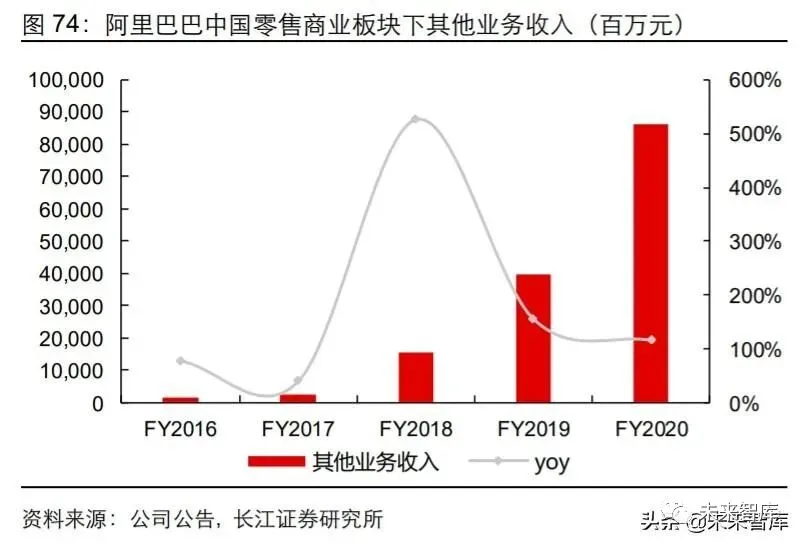 1) 中国零售商业业务主要包含淘宝、天猫、盒马等国内零售业态,收入由线上平台的 客户管理收入(CPC、CPM 广告收入为主)、天猫平台的交易佣金以及直营零售业 务收入构成,其中客户管理业务收入 1754 亿元,同比增长 20%,占总收入的 34%;佣金收入 711 亿元,同比增长 15%,占总收入的 14%;以猫超、盒马鲜生等新零 售业务为主的其他业务收入 863 亿元,同比增长 115%,占总收入的 17%;
