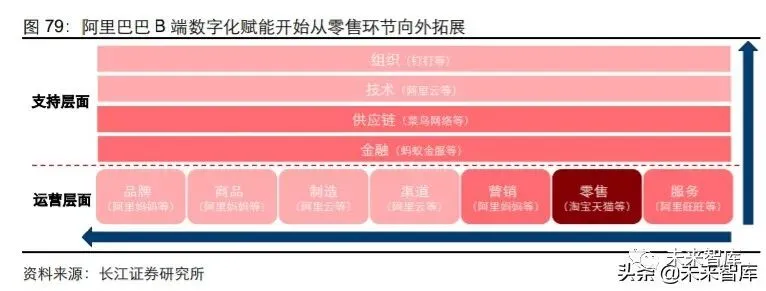 前期阿里对于 B 端的赋能大多数是聚焦零售环节。无论是成立初期用于减少交易中摩擦 成本的支付宝、阿里旺旺,还是 2013 年后大力推广的用以增加渠道效率的千人千面营 销工具,针对线上渠道末端物流环节打造的菜鸟网络,甚至包括 2016 年左右开始布局 的新零售和本地生活业务,阿里的重点均是对于渠道零售环节效率的优化。但对于 B 端 商家而言,除零售环节以外,其经营活动还包括品牌打造、商品研发、商品生产、渠道 分配以及支持层面的金融、供应链、组织管理、信息技术等方面。