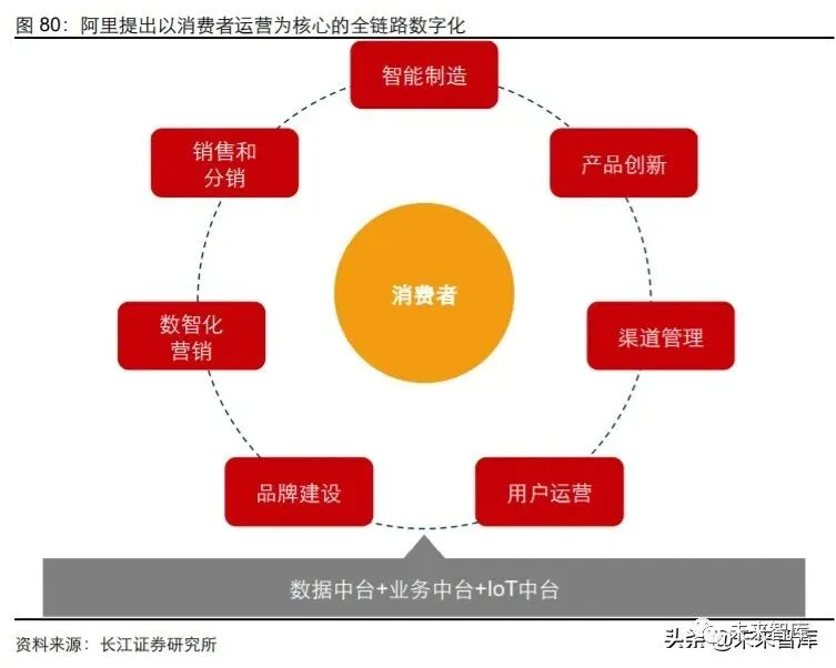 2019 年开始,阿里对于数字化赋能 B 端商家战略的重视程度明显增强。2019 年 1 月, 阿里在 2000 余家商家参会的 ONE 商业大会上推出阿里巴巴商业操作系统,同时发布 了 “A100 计划”,向合作伙伴开放数字化能力,旨在实现对商业要素的全覆盖,即“品牌、 商品、销售、营销、渠道、制造、服务、金融、物流供应链、组织、信息技术” 11 大商 业要素的在线化和数字化。2019 年 10 月世界互联网大会上,阿里董事会主席张勇先生 在开幕致辞中提出,数字化时代的商业发展催生了新商业文明。2019 年 12 月阿里第二 届 ONE 商业大会上,张勇先生再次提出商业操作系统是阿里未来面向企业客户的总战 略、总方针,阿里将会一直坚持推进下去。2020 年 3 月,张勇先生表示,新一代数字基础设施建设将成为新的发展方向。阿里巴巴商业操作系统的推出意味着阿里开始将多 元化商业场景以及大数据技术资源、云计算的底层深度结合,可以提供系统化,而非局 部的的企业服务能力。