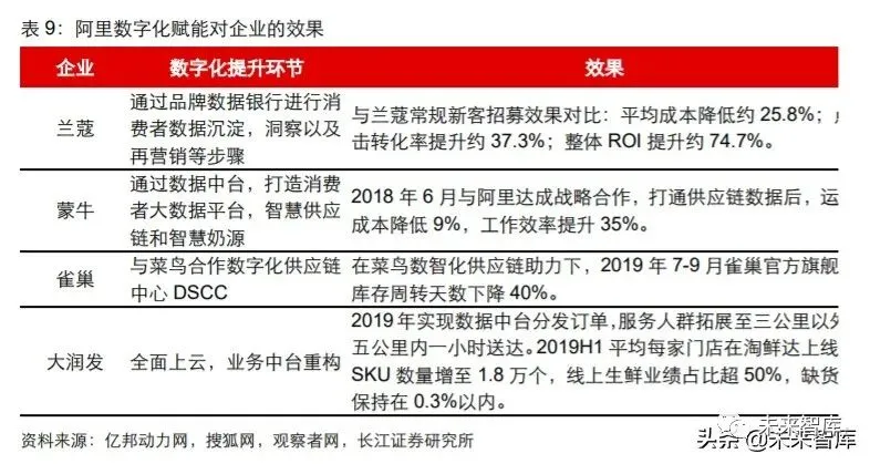 得益于阿里优秀的全链路数字化赋能力,目前已有众多商家与阿里进行数字化转型合作, 并取得了积极成效。如兰蔻在使用品牌数据银行进行精准营销后,点击转化率提升约 37.3%,整体 ROI 提升约 74.7%;蒙牛通过与阿里云合作数据中台建设,赋能供应链和 生产环节后,2019 年三季度成功实现了运输成本下降 9%,同时工作效率提升 35%。线下零售龙头大润发在获得阿里的业务中台数字化改造后,于 2019 年成功实现了淘鲜 达配送服务范围的扩大,同时平均每家门店在淘鲜达上线的 SKU 数量由 2018 年的 1.3-1.5 万个增至 2019H1 的 1.8 万个,涵盖生鲜食品和快消品,线上生鲜业绩占比超 50%,缺货率保持在 0.3%以内的较低水平,2019 年 6 月单店日均订单量达到 700 单。