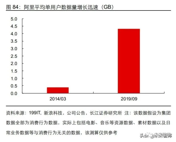 截至 2019 年 9 月,阿里的数据量在 3000PB 左右,相对于 2014 年 3 月的 100PB 增长 30 倍,假设集团数据全部为消费行为数据(实际上包括电影、音乐等资源数据、素材数据以及日常业务数据等与消费行为无关的数据,该测算仅供参考),以年活跃用户数 为基数核算后,2019 年九月阿里掌握的平均单用户数据量约为 4.5GB,而 2014 年 3 月约为 0.4GB。