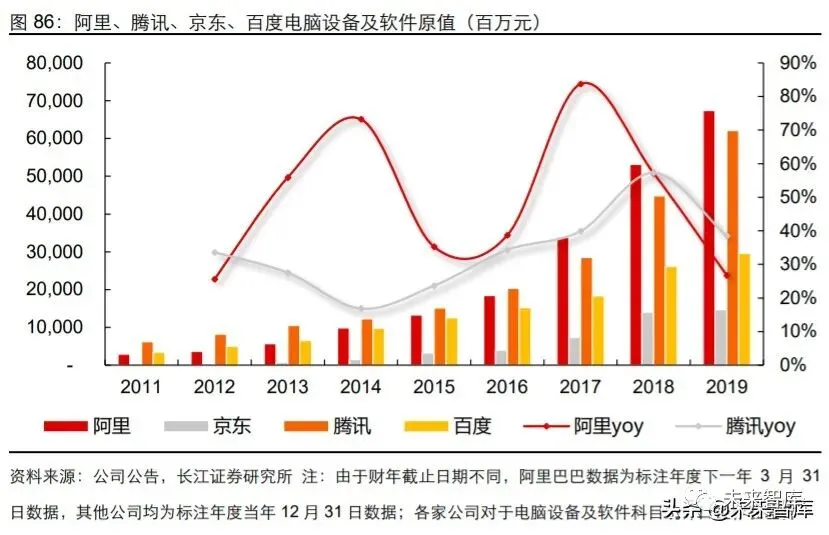 主要竞争对手表观数字化能力相对阿里均有一定差距,京东使用京东智联云进行数据存 储与计算,拼多多则依赖腾讯云进行数据存储与计算。京东智联云和腾讯云均未与阿里 云参与可比的第三方算力测评,因此,我们通过公司披露的电脑设备及软件的价值规模 进行侧面对比,其中京东 2019 年年脑设备+软件的折旧前原值为 147 亿元,腾讯为 621 亿元,而阿里巴巴 2017 年超越腾讯,2019 年已达到 674 亿元。2020 年 4 月,阿里云 宣布 3 年再投 2000 亿,投入重大核心技术研发攻坚和面向未来的数据中心建设;并且 在今年再招聘 5000 人,大规模引进顶尖科技人才,持续加码云计算业务