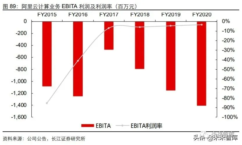 除支持阿里内部的数字化服务以外,阿里云自 2011 年开始便大规模对外提供云计算服 务,2019 年 Q4 阿里云市场份额已达 46.4%,远超其他竞争对手。2020 财年阿里云计 算业务营收达 400 亿元,同比增长 62%,EBITA 为-14 亿元,亏损率为 3.53%,相比上 一财年收窄 1.15 个百分点。