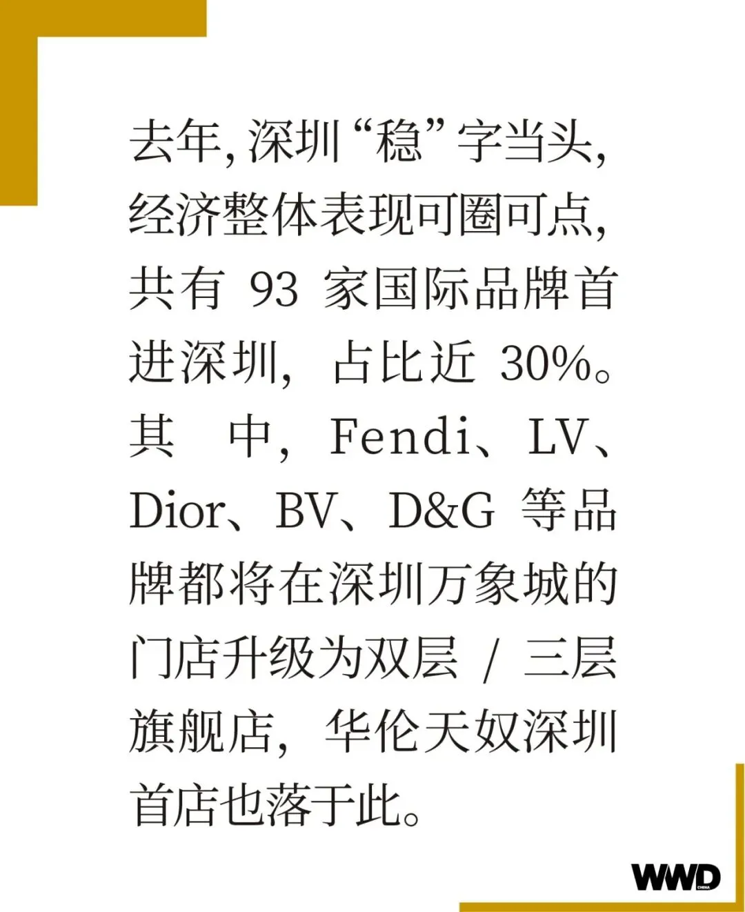 去年,深圳“稳”字当头,经济整体表现可圈可点,共有 93 家国际品牌首进深圳,占比近 30%。其中,Fendi、LV、Dior、BV、D&G 等品牌都将在深圳万象城的门店升级为双层/三层旗舰店,华伦天奴深圳首店也落于此。2023 年一开场,深圳市场向好中捷报频传,Ralph Lauren 在今年春天在深圳开启了拉夫劳伦之家(The World of Ralph Lauren)的华南首店。
